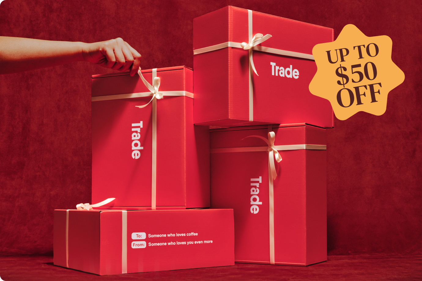 Red gift boxes with ribbons, offering up to $50 off.